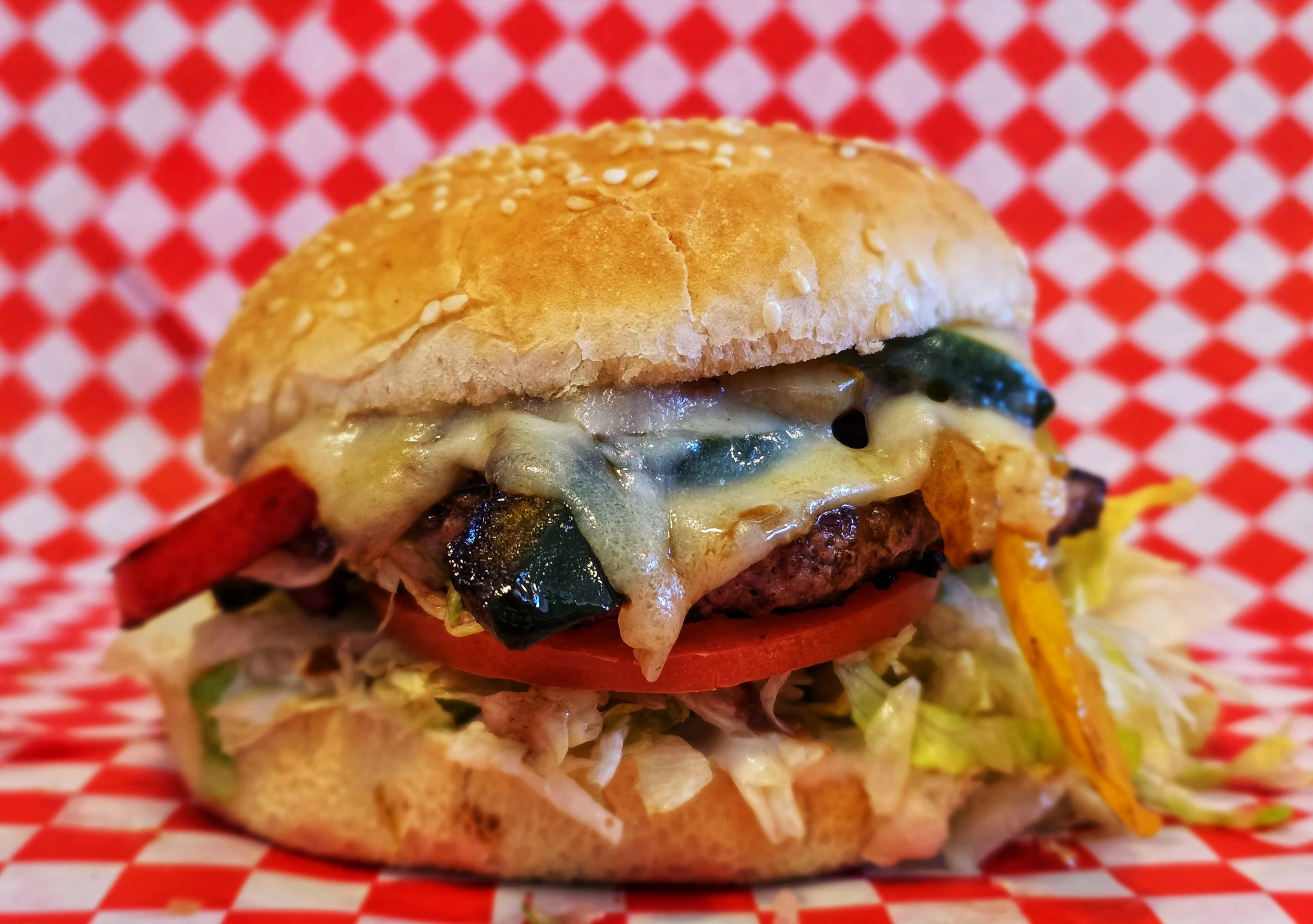 Featuring a juicy, quarter pound patty hot off the grill with provolone cheese, grilled onions and peppers. These delicious ingredients are complemented by a house-made horseradish garlic aioli sauce that adds a rich, tangy kick to each bite. All of this goodness is sandwiched between a toasted sesame bun with lettuce and tomatoes, creating a mouthwatering combination of flavors and textures that will leave you craving more. Only $5.99!"
